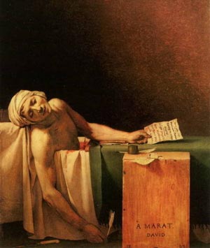 一個名字,已經(jīng)是那么的著名,甚至在中學(xué)生的歷史課上,教師講到法國大革命時,往往都會提到,稱他是一位遭敵人暗殺的革命家和英雄。但也有一些人并不這樣認為,而把他看作是一個嗜血成性的劊子手。大衛(wèi)和波德里兩位畫家表現(xiàn)他被刺殺的繪畫可以代表這兩種不同的觀點。