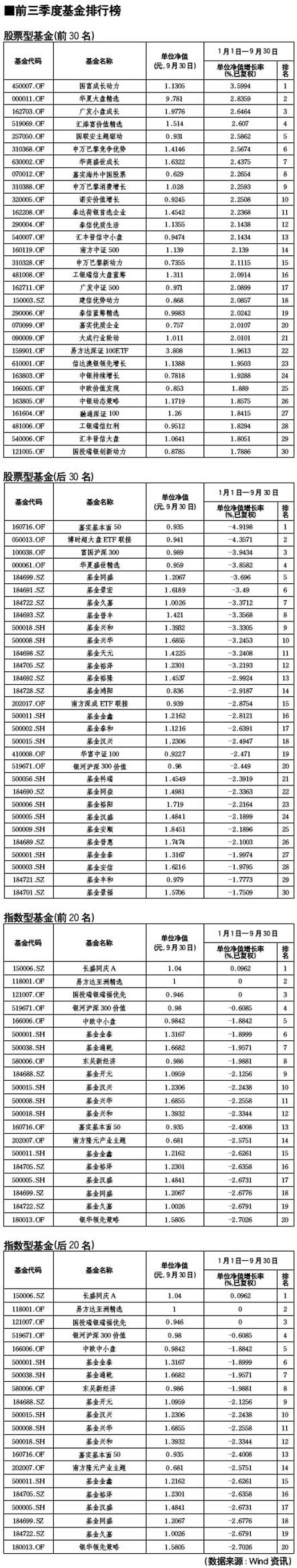 前三季度股票型基金排行榜