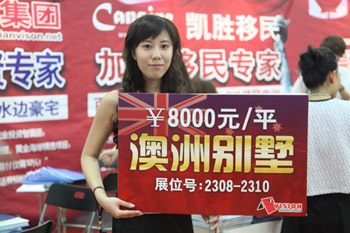 在日前舉辦的北京秋季房地產(chǎn)展示交易會上,一名禮儀小姐手拿別墅廣告牌吸引參觀的購房者。新華社發(fā)(劉爽 攝) |