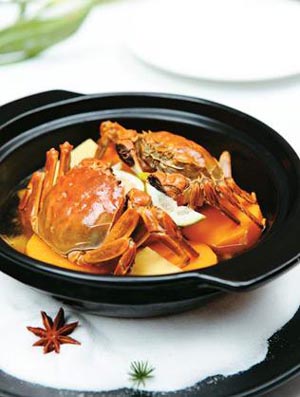 又稱凍蟹。很有聲勢(shì)的一大盤(pán),碎冰鋪底,以中國(guó)式寫(xiě)意處理裝盤(pán)。大閘蟹以黃酒醉上6-7天,待入味成熟,取出,放置大盆冰碎上活吃(很殘忍但近年來(lái)流行得一塌糊涂)。配花雕酒,邊吃邊養(yǎng)胃。裝盤(pán)講究,底盤(pán)裝飾海洋元素,珊瑚枝和小松枝、海石,很入畫(huà)面。