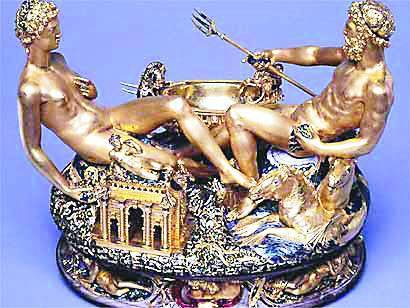 貝紐維多·切利尼(1500-1571):意大利十六世紀后半期雕塑家、樣式主義雕塑的代表人物。他受雇傭于羅馬的教皇和佛羅倫薩的執(zhí)政者美第奇家族,也被當(dāng)時的法國國王所器重。他為法國王室和意大利統(tǒng)治者制作了大量金銀工業(yè)品和雕塑作品,手法富于裝飾性,藝術(shù)技巧出色。鹽碟雖然上了5000萬歐元的保險,但實為無價之寶。它的被盜所造成的損失遠遠超過了2002年全年奧地利所有失竊藝術(shù)品的總價值,被認為是二戰(zhàn)后奧地利最大的博物館失竊案。