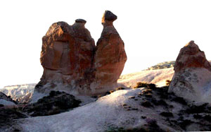 卡帕多奇亞最大的特點(diǎn)就是眾多聳立在平地上形狀奇特的小山峰,其外觀如石筍、似煙囪,不一而足,蔚為奇觀。它們是由數(shù)百萬年前三座火山噴發(fā)后散落的灰燼凝結(jié),再經(jīng)歷數(shù)千年風(fēng)化和湖河雨水沖刷逐漸形成。