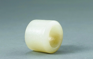 扳指起源于古代狩獵活動中,早期叫韘。使用時,將韘套于弓箭手拉弦的拇指上,以起到保護手指不被弓弦勒傷的作用。韘的質(zhì)地比較多樣,以皮革為材質(zhì)的韘實用性較強,而玉韘是為了體現(xiàn)佩戴者的身份和地位?脊刨Y料中,最早的玉韘當(dāng)屬1976年河南省安陽市殷墟婦好墓出土的一件青玉韘,這件玉韘為圓筒形,下端平齊,上端斜口,可套入成年人拇指。其外壁以雙勾線和平地隱起手法雕飾獸面紋,在獸面紋一側(cè)有兩個圓孔,相對的一面有勾弦用的凹槽。凹槽的存在說明早期玉韘具有一定的實用性,只是隨著戰(zhàn)爭規(guī)模和作戰(zhàn)方式的變化,以及玉禮制觀念的逐漸滲透,玉韘的實用性才越來越削弱,而裝飾性越來越顯示出來。正如《詩經(jīng)·衛(wèi)風(fēng)·芄蘭》所云:“芄蘭之葉,童子佩韘。雖則佩韘,能不我甲。容兮遂兮,垂帶悸兮。”