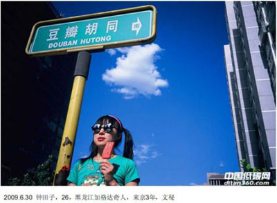 于是,從2009年6月1日開始到2010年5月31日,盧為薇和她的另外一個朋友每天都在北京拍一張照片。照片里面會有一個北京的路牌,當(dāng)天空是藍(lán)色時(shí),她們還會請一位路人戴上一副滑稽的墨鏡出鏡。