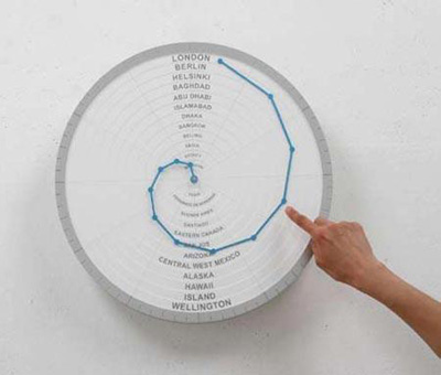 Hands只要一個(gè)表盤就可以告訴你當(dāng)?shù)貢r(shí)間。設(shè)計(jì)師們將時(shí)鐘指示設(shè)計(jì)成螺旋形,在時(shí)鐘表面以同心圓的方式標(biāo)有世界不同城市的名字,當(dāng)表盤上的時(shí)針轉(zhuǎn)動(dòng)時(shí),指針?biāo)傅臅r(shí)間對(duì)應(yīng)了城市的名字,只要找到指針上的藍(lán)色小點(diǎn)就可以知道當(dāng)?shù)氐臅r(shí)間了。