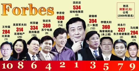 新榜單中的400人,提供了許多關(guān)于中國(guó)持續(xù)的經(jīng)濟(jì)繁榮和過(guò)去一年中財(cái)富膨脹的新觀點(diǎn)。在服務(wù)消費(fèi)者的行業(yè)中的企業(yè)家繼續(xù)領(lǐng)先。榜單首位的宗慶后是娃哈哈飲料生產(chǎn)商。自去年宗慶后解決了娃哈哈和達(dá)能的糾紛,娃哈哈的天空變得蔚藍(lán);ヂ(lián)網(wǎng)的興起,本土企業(yè)對(duì)市場(chǎng)的掌控已經(jīng)超過(guò)了外國(guó)競(jìng)爭(zhēng)對(duì)手,今年榜單第二名——百度搜索引擎的創(chuàng)始人之一李彥宏就是最好的體現(xiàn)。