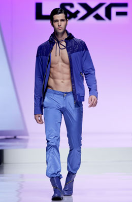 男裝品牌L&XF以“激情誘惑”“時空浪漫”兩個系列詮釋了“未來主義”的主題!凹で檎T惑”展示了大面積藍色與紅色的搭配;“時空浪漫”中,高貴神秘的紫色、輕盈活力的果綠色等一系列明亮的色彩被創(chuàng)意組合“以往男裝總是給人色彩暗淡、線條呆板的印象,要打破男裝設計的單一化,就得進行大膽創(chuàng)新,比如藍色、紅色等明亮色彩就能夠搭配出視覺沖擊力,讓男人更加時髦而富有運動感!盠&XF設計師劉小飛向記者表達了這樣的觀點。