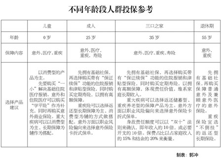 不同年齡段的消費(fèi)者投保也應(yīng)該各有側(cè)重。王鵬說,剛參加工作的年輕人,交費(fèi)能力有限,生活壓力也不大,可以考慮定期壽險和意外保險。結(jié)婚后,夫妻雙方面臨著償還房貸、撫養(yǎng)孩子等較大的生活壓力,身體健康狀況也開始下降,這時候應(yīng)該增加保障性保額,補(bǔ)充醫(yī)療保險和子女的教育金。到了40至50歲,資產(chǎn)一般會比較充裕,可以考慮進(jìn)行多元化的資產(chǎn)配置,不要把雞蛋放在一個籃子里。