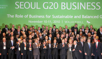 11月11日,出席首爾G20商務(wù)峰會(huì)的各國代表在會(huì)場(chǎng)合影留念。新華社發(fā) |