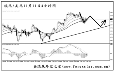 ▲澳元兌美元在突破平價(jià)水平之后的運(yùn)行幅度有限,目前匯價(jià)小幅下調(diào),但仍保持在1.0000上方。圖中上升趨勢(shì)線為日線圖形成,斜率陡峭,澳元將首先挑戰(zhàn)此位。中線的道氏理論顯著低點(diǎn)在0.9650附近,澳元若想結(jié)束其跌勢(shì)還將會(huì)經(jīng)歷很大的一段考驗(yàn)。