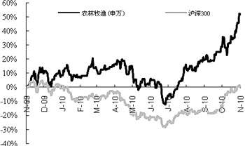 市場的表現(xiàn)也反映了這一點(diǎn)。11月第一周,A股市場農(nóng)林牧漁行業(yè)指數(shù)(申萬分類)上漲7.9%,表現(xiàn)好于大盤,同期上證指數(shù)、深證成指、滬深300分別上漲5.1%、2.7%、4.2%。