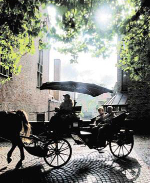 “這只是我偶爾在晚上才做的兼職。相比握方向盤,我還是更喜歡拉著韁繩!盞LASS先生說這番話時,我已坐上他的車,從火車站拐了一個彎,進入布魯日古城。那時下著淅淅瀝瀝的小雨,昏黃燈光映照下的狹窄小路迷宮般地七拐八繞,兩旁的老房子和偶爾出現(xiàn)的教堂、小橋從窗外閃過,這樣的情景,與布魯塞爾簡直有天壤之別。車在并不平坦的古老石磚路上開過時咯噔咯噔作響,豪華車的減震系統(tǒng)似乎并不適合這里。“這樣的地方,更適合坐馬車!