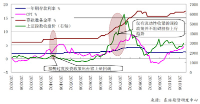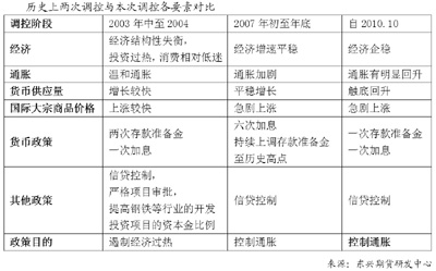 綜合以上分析,我們認(rèn)為,近期貨幣政策收緊的目的很明確,那就是遏制通脹,而不是通過給經(jīng)濟(jì)降溫抑制社會(huì)總需求。實(shí)際上一次性的上調(diào)存款準(zhǔn)備金以及加息對(duì)流動(dòng)性“抽血”效應(yīng)并不顯著,市場(chǎng)近期作出較大反應(yīng)主要是因?yàn)閷?duì)于央行連續(xù)加息的預(yù)期。因?yàn)槿绻酉⒅芷诔霈F(xiàn),將會(huì)給股市和商品帶來流動(dòng)性收縮后的短期資產(chǎn)價(jià)格重估,也會(huì)在一定程度上抑制投資需求和消費(fèi)需求。只要國(guó)家不出臺(tái)限制社會(huì)總需求的政策,股市和商品都將迎來中長(zhǎng)期上漲行情,可逢低建立中長(zhǎng)線多單。歷史數(shù)據(jù)顯示,僅僅是收縮流動(dòng)性的政策并不會(huì)使股市和商品陷入明顯回調(diào),每一輪流動(dòng)性緊縮也都伴隨著股指和商品的上升周期。