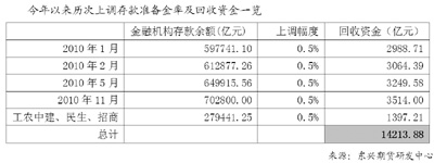 近期國(guó)內(nèi)金融市場(chǎng)異動(dòng),股票市場(chǎng)和期貨市場(chǎng)都出現(xiàn)大幅度回調(diào),這一切均發(fā)生在中國(guó)人民銀行于11月10日宣布上調(diào)存款準(zhǔn)備金之后,而此前央行剛剛進(jìn)行了兩年來的首次加息。根據(jù)每次上調(diào)準(zhǔn)備金率前一個(gè)月的金融機(jī)構(gòu)存款余額測(cè)算,五次上調(diào)準(zhǔn)備金率共從銀行體系中回收逾1.42萬億元的流動(dòng)性,單單最近一次上調(diào)準(zhǔn)備金率就抽走超過3500億元資金。