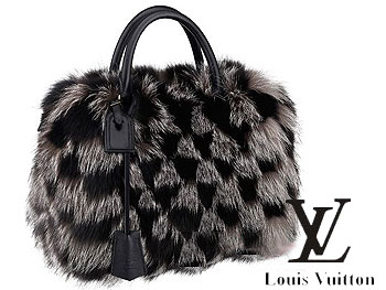 一款蓬松狐貍毛制成的手袋則使用灰黑或棕褐相間的狐貍毛皮拼接,再次表現(xiàn)品牌經典的Damier格紋。