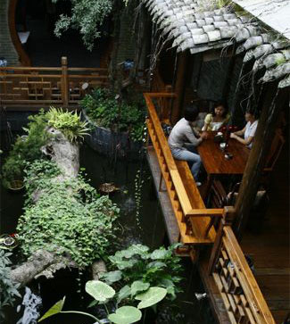 第二次去,下起了大雨,白天的紅燈籠“端莊”了許多。我記得我在熊貓屋中無趣地盤桓,盡可能地在屋檐下避雨,然后拐進(jìn)一家叫做“繁花似錦”的咖啡館,而從中心位置只能容一人獨(dú)立的表演臺來看,這里到了晚上便是酒吧,并奉行酒吧一切幽暗多情的準(zhǔn)則。座位擠到仿佛我立馬能揪起鄰座的衣領(lǐng),東西難吃得讓人懷疑里面的成分,但這兒依然高朋滿座。在這樣的一家店,座椅也非多高檔豪華,但出奇舒服,那種舒服是家里老沙發(fā)的那種,靠著臨街的美人靠和雕花木窗。雨還在下,透過兩盆花間的蛛網(wǎng),一條淺淺的小溪正奮勇騰躍著。