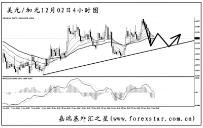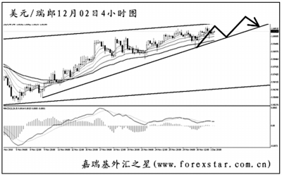 ▲美元兌瑞郎在圖中上升趨勢線的支撐下走高,但短線動能已明顯減弱。同時從日線圖上看,匯價處于一個下跌旗形中繼的上沿下方,能否升破旗形上沿成為美元兌瑞郎后市轉(zhuǎn)為漲勢的關(guān)鍵。目前價格處于被上下夾擊的狀況,建議暫時謹慎入場,最好在突破后采取跟隨的方式交易。