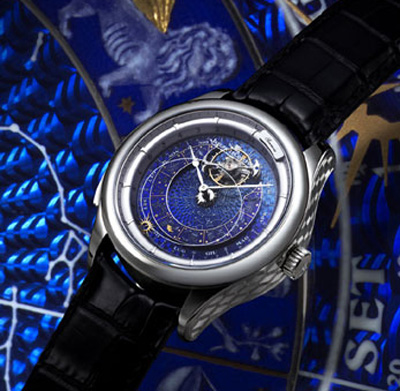 年年初推出的復(fù)雜功能款腕表。腕表完美融合機(jī)械學(xué)與美學(xué),集三種頂級鐘表復(fù)雜功能于一身,演出一場"天作"之舞:三問報(bào)時(shí)、飛行陀飛輪和恒星萬年歷,共同演繹了獻(xiàn)給威尼斯城的完美舞姿。飛行陀飛輪不僅具有調(diào)節(jié)功能,在展現(xiàn)北半球星空圖的藍(lán)色雕紋表盤上,更是恒星時(shí)針。層層疊疊的透明效果凸現(xiàn)了魔幻般的高超手工工藝。太陽圍繞表盤一周恰好24