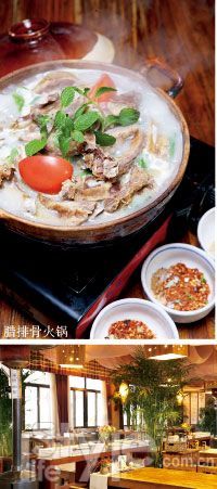 在一間隱蔽到難以尋覓的小院落里,有一家別具特色的火鍋店,說(shuō)它特別是有根據(jù)的,這里沒(méi)有名聲顯赫的四川火鍋,也沒(méi)有傳統(tǒng)的老北京銅鍋,唯一能找到的是一鍋熱氣騰騰顫顫悠悠上桌的豬蹄火鍋。在這個(gè)半大的小院里,室內(nèi)室外都是就餐區(qū)域,二層還有一個(gè)可以看風(fēng)景的露臺(tái),當(dāng)然僅限夏天使用。屋里的墻壁上懸掛著不少飾物,柔和的燈光和私密的環(huán)境讓人瞬間放松。食客們來(lái)這兒只有火鍋可以選擇,豬蹄富含膠原蛋白,是能讓女生容光煥發(fā)的利器。說(shuō)到老板的創(chuàng)意來(lái)源,還要?dú)w功于在外地與朋友的一次聚餐。喜歡喝湯的可以點(diǎn)木瓜豬手鍋,整只木瓜切成大塊配著玉米、冬瓜、豬蹄一起熬燉,白湯濃郁,是經(jīng)過(guò)2、3個(gè)小時(shí)小火煨出的成果,而且一旦鍋內(nèi)湯頭不足,加入的也不是白水而是原湯,味道保證從頭至尾一樣鮮美。原湯對(duì)重口味的人似乎不夠過(guò)癮,那就來(lái)辣鍋刺激你的神經(jīng)吧,紅白交替顏色分外鮮明,辣料與豬蹄相得益彰,不用多蘸調(diào)料也能吃得很香。