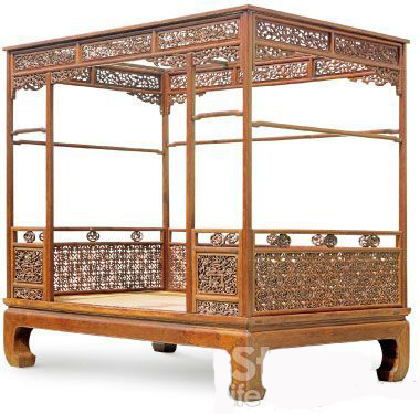 這張床制作精細,構(gòu)思巧妙,沉穩(wěn)的床座和空靈剔透的圍子和諧統(tǒng)一,體現(xiàn)了明式家具既注重結(jié)構(gòu)的合理性又強調(diào)裝飾效果的特點。