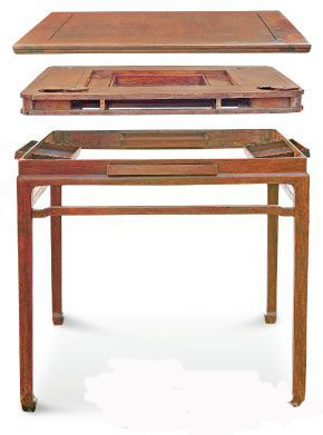 棋桌為方桌形,棋桌內(nèi)裝可移動嵌象牙雙陸棋盤,兩側(cè)有狹長小室,四角有圓形小室并配白銅紐,束腰四面各安裝抽屜一具。