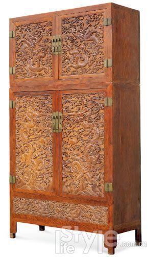 大四件柜又稱“頂箱柜”,是非常實用的家具,成對陳設,頗有氣勢,所以又是身份和地位的象征。由于其體積碩大,一般房舍難以容身。隨著社會的變遷,經(jīng)常被拆散或改作它用,成對完整傳世極為難得,存世量屈指可數(shù)。