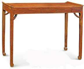 案形結(jié)體的家具常有翹頭,桌形結(jié)體的家具很少見,而此桌小而有翹頭。條桌上安抽屜,多為清式家具,明式條桌很少見,而此桌有扁小的暗抽屜三具。明式家具中有抽屜桌,但形式與此大異。因其造型及做法越出常規(guī),只能視為條桌的變體,所見僅此一例。