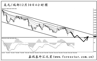 ▲美元兌瑞郎跌破日線圖旗形下沿之后,沿通道一路走弱,目前匯價正在挑戰(zhàn)10月中旬的低點0.9460支撐,跌破后下方空間將無比廣闊。最近瑞郎的走勢分化,且是歐系貨幣中最強勁的。目前對美元兌瑞郎絕對不能抱以抓底的思路,應(yīng)等待調(diào)整節(jié)奏出現(xiàn)后繼續(xù)做空。
