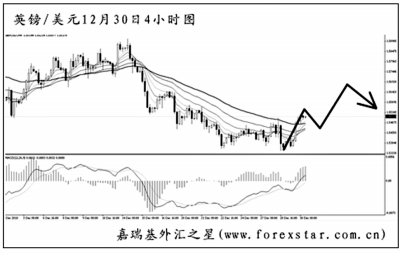 ▲英鎊兌美元短線下跌的動能有所減緩,圖中MACD的底背離發(fā)揮了一定的效果,匯價已經(jīng)將均線系統(tǒng)升破,客觀趨勢進入到轉(zhuǎn)換市。圖中道氏理論顯著高點阻力1.5510已被突破,后市英鎊將上行挑戰(zhàn)1.5650一線。考慮到英鎊的弱勢,匯價直接大幅沖高的希望不大。