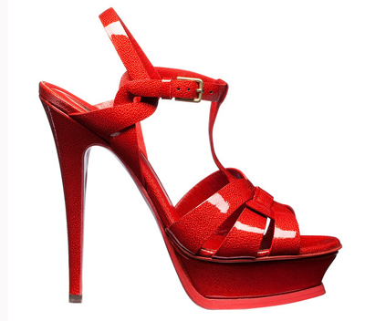 YSL的Tribute系列有多種款式,包括船鞋、T帶涼鞋和slingback涼鞋等,其中標識度最高的當屬T帶涼鞋,每季款式不變,色彩和材質(zhì)隨潮流而變。Tribute系列的典型標志是層次鮮明的水臺底,鞋尖部分削掉一塊,不顯厚重。2011早春系列的Tribute