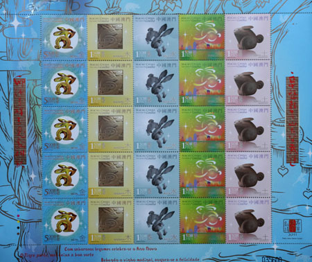 日前,兔年郵品新聞發(fā)布會(huì)在澳門(mén)特區(qū)政府郵政局舉行,據(jù)介紹,郵政局在1月5日發(fā)行2011年首套郵品,以兔年為主題,整套5枚郵票售價(jià)為11元,亦會(huì)推出首日封,小型張和郵票茶壺禮盒等,供市民選購(gòu)。