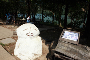 從音樂(lè)博物館后門出來(lái),一大片碧綠的青草地就在眼前。綠草茵茵,樹木環(huán)繞,分外怡情。而穿過(guò)大草坪,就看到湖邊立著個(gè)可愛(ài)的大雪人,還有一條長(zhǎng)凳。這就是《冬季戀歌》中主人公留下初吻回憶的地方,可愛(ài)的雪人正是他們的杰作,旁邊還擺放著兩位主角的照片。坐在長(zhǎng)凳上,看著他們含情脈脈的笑容,撫摸著潔白的雪人,重溫“戀歌”場(chǎng)景,再次感受到了純真初戀的美好。