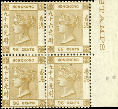 由于存世新票為數(shù)極少,香港維多利亞女皇像96先時橄欖棕色四方連郵票不時與中國大陸“改值小字”郵票相提并論,兩者同樣珍稀及深受藏家追捧。96先時橄欖棕色四方連票作為香港集郵界中的頂級瑰寶,可謂當(dāng)之無愧!
