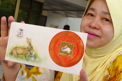 1月18日,馬來西亞郵政局推出兒童寵物系列郵票,其中為了配合華人農(nóng)歷兔年,郵政局特別設(shè)計以中國圖騰燙金配以紅色底的兔子小全張,售價5元林吉特。這是馬來西亞郵政局自2000年推出龍年郵票以來,再次推出華人生肖郵票。