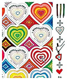 小版張(圖3)右邊的等式表達(dá)的是:彩色鉛筆+待上色的心(郵票)+上色(DIY)+你的一顆愛(ài)人的心=幸福。當(dāng)然,除了上色,你也可以寫(xiě)上對(duì)你來(lái)說(shuō)有特殊意義的字母或你的大名,或者簡(jiǎn)短的祝福語(yǔ)來(lái)傳達(dá)情意。