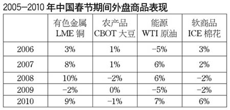 從近五年來春節(jié)期間外盤代表性商品的表現(xiàn)來看,市場總體呈現(xiàn)出漲多跌少局面(見下表)。