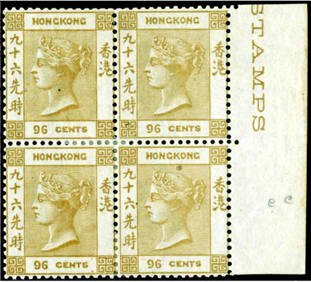 圖為以640萬港元成交的錯色印刷香港維多利亞女皇像96先時橄欖棕色四方連帶原膠郵票。