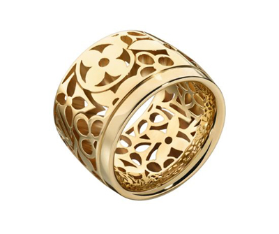 Monogram Résille 系列的設(shè)計靈感來自路易威登經(jīng)典的Monogram黃金鏤空蕾絲。優(yōu)雅的蕾絲將Monogram花朵與首字母標(biāo)志纏繞在一起,鏤空部分肌膚若隱若現(xiàn),十分性感。簡潔的設(shè)計,經(jīng)典的造型,最適合作為對戒呈現(xiàn)給心愛之人。