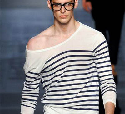 Gaultier依舊將喜歡的海軍藍條紋衫置于2011年春夏新系列中,在T臺上與白色長褲、白色尖頭皮鞋搭配在一起,一派摩登好少年模樣;同樣是條紋衫+白褲、白鞋,Junya