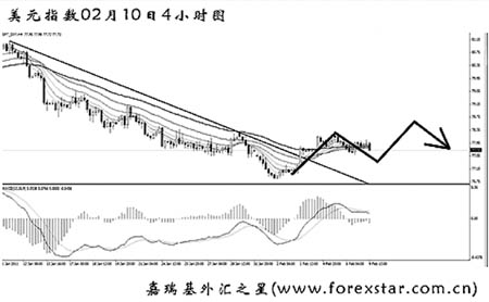 從圖上看,美元指數(shù)未能挑戰(zhàn)前方低點75.60一線的支撐,自低位強力反彈,將圖中的下降趨勢線升破,此前持續(xù)的MACD底背離信號發(fā)揮了一定的效果。4小時圖上美元指數(shù)下跌的道氏理論最后一個顯著高點在78.30,在有效突破此位置之前,美元指數(shù)很難展開持續(xù)的上漲,預計未來一周美元指數(shù)仍會對此阻力發(fā)起有力的沖擊。