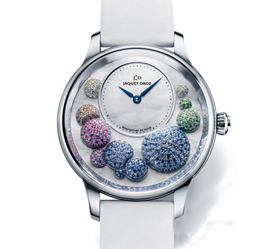 采用雅克德羅自動(dòng)上弦2653機(jī)芯,手表直徑41毫米,18k白金表殼,珍珠母貝表盤,上鑲35顆黃寶石,154顆藍(lán)寶石,51顆粉色寶石,22顆橙色寶石以及46顆石榴石,限量發(fā)售8只