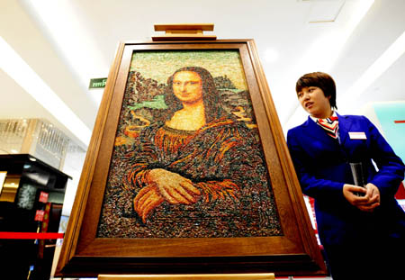 3月7日,一幅《蒙娜麗莎》寶石作品在沈陽(yáng)一商場(chǎng)展出,吸引了眾多市民的目光。這幅作品由收藏者用30年時(shí)間,耗用10萬(wàn)多克拉各種顏色的寶石原石,并聘請(qǐng)歐洲工藝大師歷時(shí)五年打造而成,價(jià)值不菲。新華社發(fā)