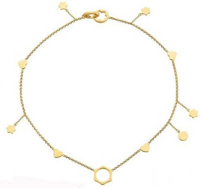 另一款18K黃金手鏈飾串上兩顆星形金飾及經(jīng)典鏤空星形環(huán),于兩枚心形金飾烘托下更覺(jué)俏麗;而18K黃金項(xiàng)鏈不但綴以鏤空星形環(huán),兩旁四顆星形金飾與四顆心形金飾相間排列和諧有致,金光妙曼躍動(dòng),如一闋華麗樂(lè)章。