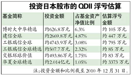 日經(jīng)指數(shù)暴跌,讓投資于日本股市的QDII基金深陷其中。據(jù)統(tǒng)計(jì),目前已經(jīng)成立的QDII基金共有33只,其中投資于日本股市的QDII較少,共有6只,占比不到兩成。據(jù)基金2010年四季報(bào),截至去年12月31日,上述6只QDII基金投資于日本股市總額約2.9億元。據(jù)估算,上述基金兩日浮虧共計(jì)約4888萬(wàn)元。