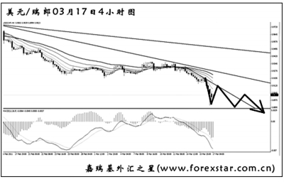▲美元兌瑞郎在經(jīng)過(guò)了3周的橫盤之后,選擇繼續(xù)加速下行,且下跌斜率再度加大。由于美元兌瑞郎已經(jīng)創(chuàng)出歷史新低,下方已沒有任何支撐可以托住匯價(jià),但下跌力度過(guò)大,預(yù)計(jì)將發(fā)生一定的調(diào)整,圖中最下方一條壓力線將首先遭到挑戰(zhàn),但想直接觸碰中間那條趨勢(shì)線的難度較大。