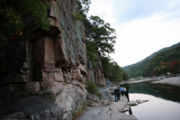 第五景“舍人巖”是一塊巨大的絕壁,據(jù)說在朝鮮成宗大王時期,出生丹陽的時任“舍人”之官的高麗末期大學(xué)長,曾在此停留,因而得名。舍人巖周邊,水邊的扁平巖石上雕刻著圍棋板和象棋板,也是吸引到此的游人們的一大看點。在此思念古人,下下棋子,感受一下古時吟詩作對、觀花賞月的意趣,倒也別有一番情致。