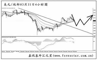 ▲美元兌瑞郎的反彈將4小時圖下降趨勢線突破,但從日線圖上看,均線系統(tǒng)的壓制作用仍然保持,同時道氏理論顯著高點的阻力在0.9370,升破后方可結(jié)束階段性的下跌。從圖中看,由于美元兌瑞郎此波反彈的力度有限,匯價仍然有向趨勢線發(fā)起回抽的風險。向上做多需謹慎。
