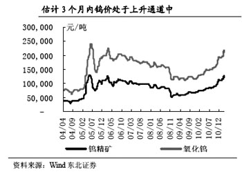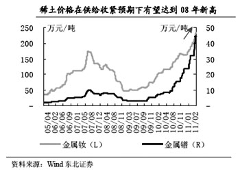 銀河證券評論稱,《通知》表明國家將長期持續(xù)整頓和規(guī)范鎢、銻和稀土行業(yè)。國家堅(jiān)持總量控制的同時(shí),將暫停受理新的鎢、銻和稀土礦勘查開采登記申請時(shí)間從2011年6月30日延長一年,到2012年6月30日,會(huì)加劇市場的資源緊張感受。