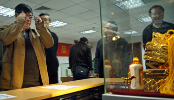 一瓶被譽為“酒王”的“精裝漢帝茅臺酒”成交價高達890萬元,刷新了茅臺酒拍賣成交價格的歷史紀錄。新華社發(fā)(彭年/攝) |