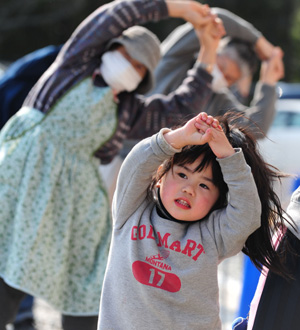 在日本陸前高田市一個避難所前,一名兒童和大人一起跟著志愿者做廣播操。地震海嘯給人們帶來難以磨滅的心理創(chuàng)傷,但只要看到孩子們充滿朝氣的笑臉,就再一次充滿希望。記者